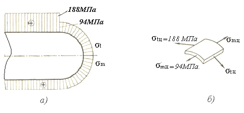 Для второго случая (рисунок 1.25, б) в любой точке стенки возникает линейное напряженное состояние (σm=0, σ1=σt, σ2=σ3=0) и эпюра σt одновременно является эпюрой σ1.