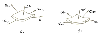 В заключение объясним скачок σt при переходе от цилиндрического участка к сферическому. Происхождение этого скачка становится ясным после сравнения элементов, вырезанных из стенок цилиндрического и сферического участков (рисунок 1.22). Действительно, для первого элемента (рисунок 1.22, а) равнодействующая dP сил давления уравновешивается только напряжениями σtц (меридиональные напряжения не дают проекции на нормаль к элементу). Что касается второго элемента (рисунок 1.22, б), то здесь σtс и σmc дают равные проекции на нормаль, вследствие чего каждое из них оказывается в два раза меньше, чем σtц.