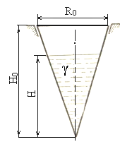 Пример 4. Из условия прочности определить, до какого уровня Н можно заполнить жидкостью с удельным весом γ = 14·103 Н/m3 конический резервуар (рисунок 1.27) при толщине стенки δ = 6 мм, высоте Н0= 9 м и радиусе основания R0= 4,5м. Принять [σ] = 50 Н/мм2. Применить гипотезу наибольших касательных напряжений.