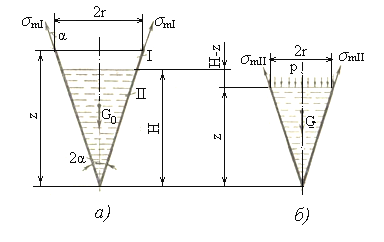 Учитывая, что r=z∙tgα и R=H∙tgα (рисунок 1.28, а), получаем окончательно