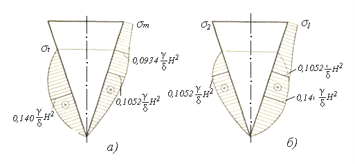 а) эпюры σm и σt; б) эпюры главных напряжений