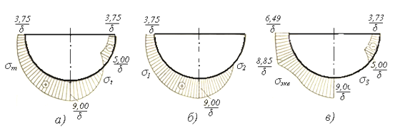 Для той же цели можно ограничиться построением и анализом эпюры главных напряжений, так как по ним легко сопоставить величины эквивалентных напряжений для различных точек стенок.