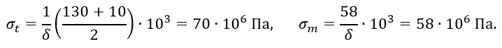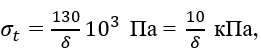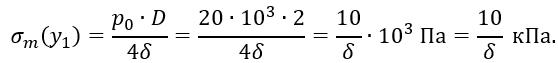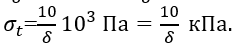 при y1 = h1/2 = 0,5 м, σt = 85/δ кПа, σm ≈ 44/δ кПа,