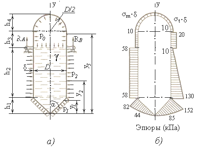 а) геометрические параметры и нагрузки; б) эпюры продольных сил в стенках сосуда
