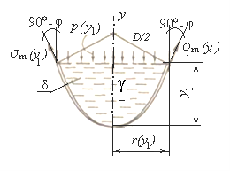 Меридиональные напряжения на том же уровне y1 определим из условия равновесия нижней отсеченной части сосуда (рисунок 2.7)