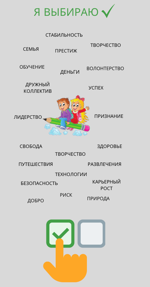 Ниже представлен список возможных потребностей и интересов. Попробуй выбрать самые важные для себя. Ты можешь выделить их на рисунке или выписать и оценить степень важности по 10-балльной шкале.