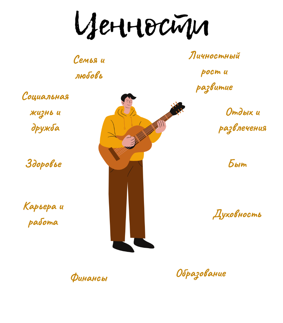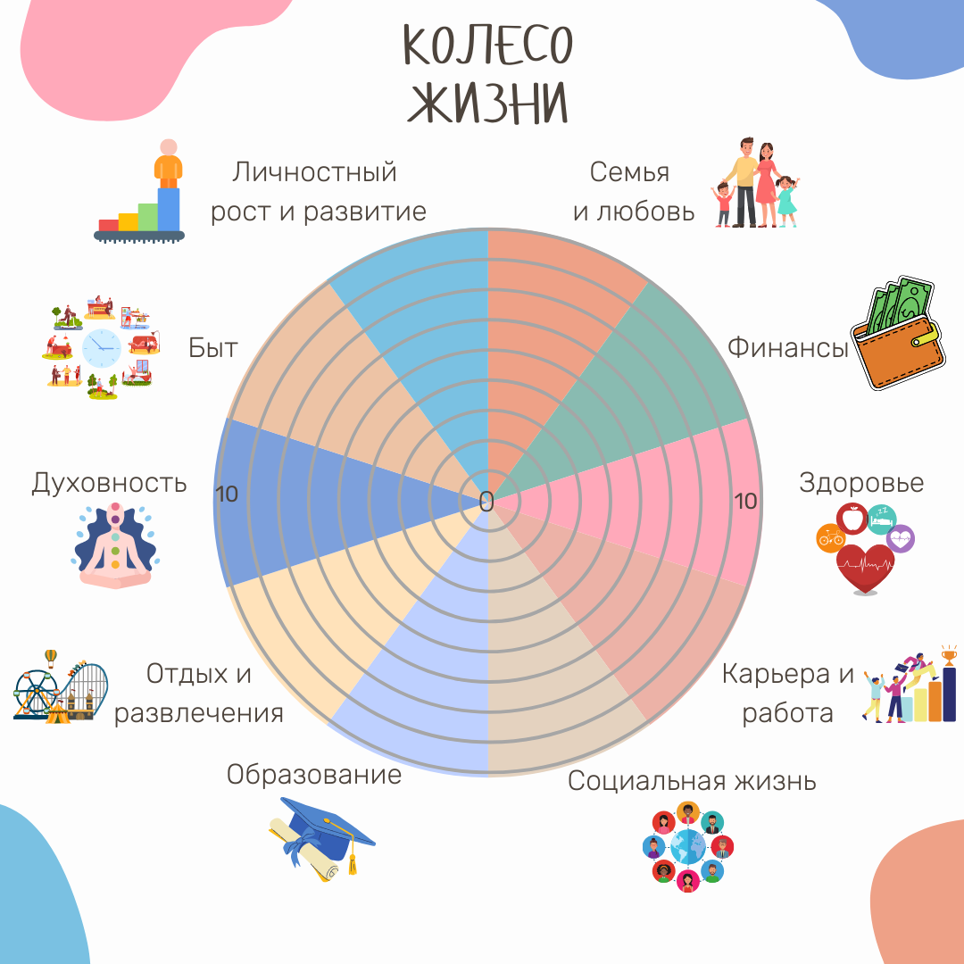 Очень важно научиться определять и понимать, какие ценности имеют важное значение для счастья и успеха. В этом деле тебе поможет инструмент «Колесо жизни». Он позволит оценить баланс и удовлетворенность разными составляющими твоего благополучия.