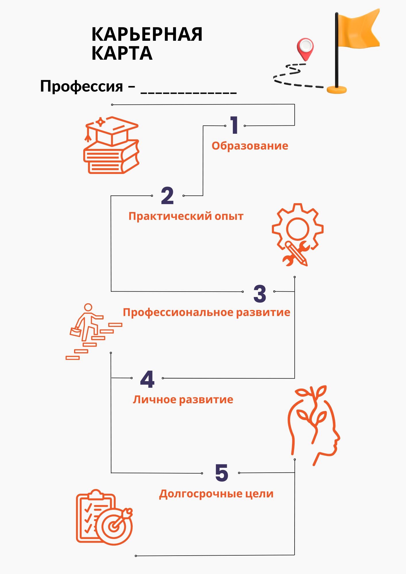 Составление карьерной карты поможет тебе лучше понять, какой путь предстоит пройти, чтобы достичь своей цели. Она будет служить твоим ориентиром и мотивацией на этом пути. Удачи!
