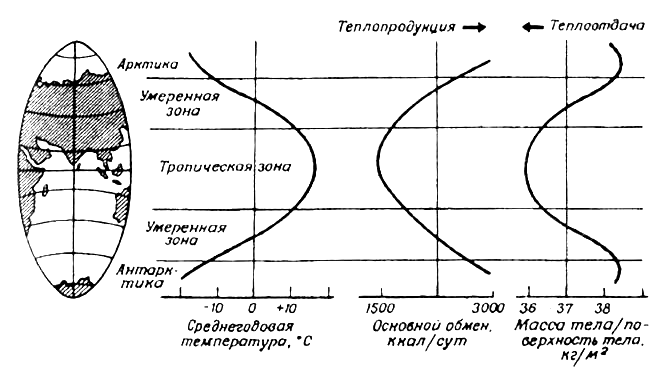 Правило Бергмана и Аллена, когда внешние характеристики коррелируют с температурными показателями среды обитания характерны и для человека. Оно выражается в разном типе тела, длине верхних и нижних конечностей, уровне подкожного жира и других показателях энергетических различий.
