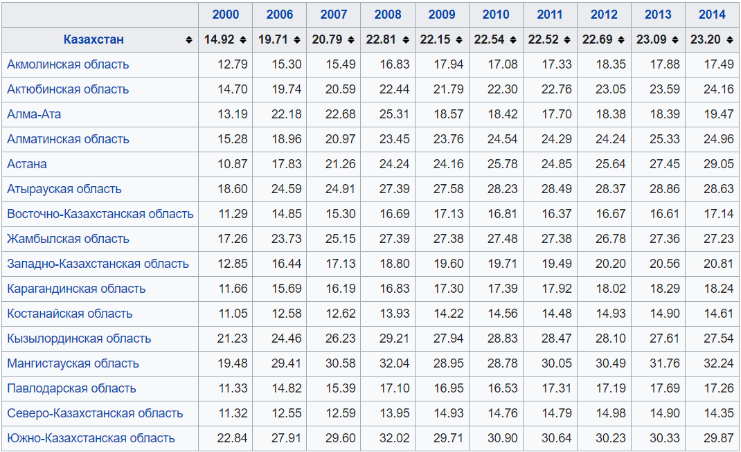 Общий коэффициент рождаемости по данным Агентства Республики Казахстан по статистике за эти годы, по областям и городов республиканского значения (в %) [42].