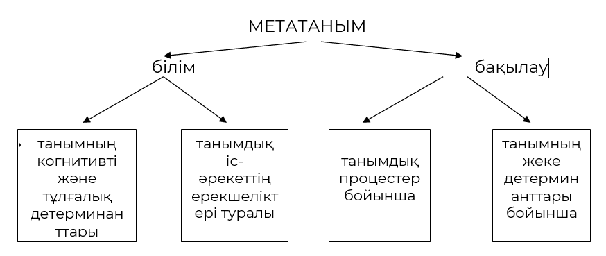 Қазіргі уақытта метатанымның ең көп кездесетін анықтамасы –метакогнитивті білім және метакогнитивті бақылау сияқты екі негізгі аспект арқылы метатанымның ашылуы. Осы идеяларға сәйкес метакогнитация субъектінің танымдық сипаттамаларын, танымдық процестерді білу мен бақылауды қалыптастырады. Метатанымның негізгі компоненттерін көрсететін жалпы сұлба келесідей (4 сурет).