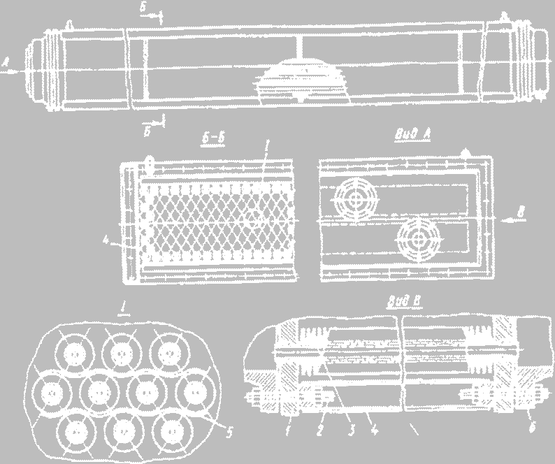 Ауа салқындатқыштың жылу алмасу бөлімі төрт, алты немесе сегіз қатарлы құбырлардан 3 тұрады (1.28-сурет), екі құбырлы парақтардағы 1 теңбүйірлі үшбұрыштардың жоғарғы жағына орналастырылған. Құбырларды жағу немесе дәнекерлеу арқылы жағу арқылы бекітеді. Түтік шоғырының қаттылығын қамтамасыз ету үшін секция металл жақтаумен 4 нығайтылады. Алайда, жұмыс кезінде торды рамамен байланыстыратын шпилькалардағы гайкаларды 2 құбырлардың мүмкін температуралық созылуынан асатын қашықтыққа бұрап алу керек. Түтік шоғырында әр түтікте жеке ауытқу болуы мүмкін. Құбырлардың жоғарғы қатарындағы қабырғаның төменгі қатардағы құбырлармен жанасқан жолдар арасындағы байланысын болдырмау үшін қалыңдығы 2 мм ені 15 мм-ге жуық алюминий таспадан 5 жасалған.