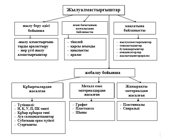 в) жылу тасымалдағыштардың қозғалыс бағытына байланысты – тікелей ағынды, қарсы ағынды, қарама-қарсы ағынды және т.б.
