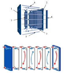 1 – жалғанатын құбырлары бар бекітілген тақтайша, 2 – артқы қысым плитасы, 3 – тығыздағыштары бар жылу алмасу тақталары, 4 – жоғарғы бағыттаушы, 5 – төменгі бағыттаушы, 6 – артқы, тірек, 7 – бұрандалы шыбықтардың жиынтығы.