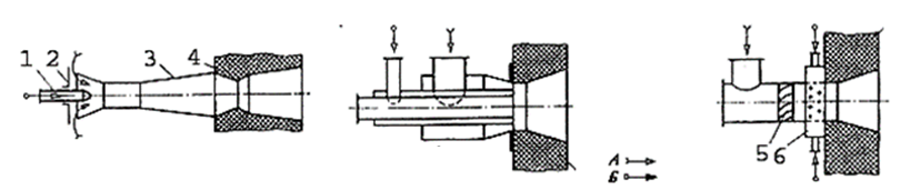 1 – газ шүмегі; 2 – реттеуші ауа жапқышы; 3 – араластырғыш; 4 –керамикалық саптама; 5 – қалақты бұрағыш; 6 – газ коллекторы; 7 –оттықты қаптау; А – ауа; Б – газ