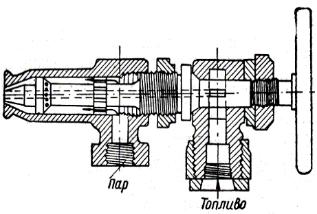 Мұнай зауытында тәжірибеде қарапайымдылығына байланысты бу шашыратқышы бар ең көп таралған саңылаулар (2.11-сурет). Алайда, олар үлкен бу шығынын қажет етеді (0,3–0,6 кг/кг отын).