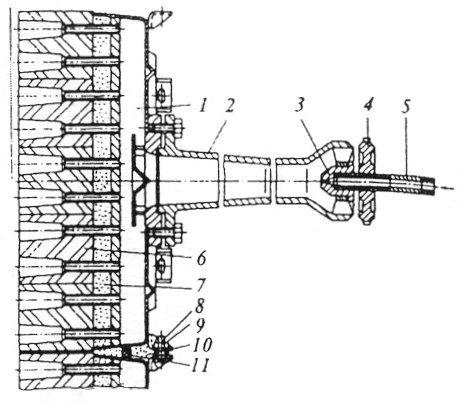 Форсунканың ішкі құбыры бойынша мазут (2.15-сурет) тарату шайбасы арқылы отын құйғышының айналма каналына жүргізіледі және одан әрі тангенциалдық арналар арқылы бұрау камерасына түседі, айналмалы-үдемелі қозғалысты ала отырып, саптамадан шығады және ортадан тепкіш күштер есебінен шашырайды.