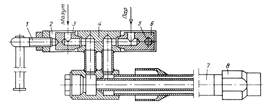 1 – созылған бұранда; 2 – қапсырма; 3 – бу штуцері; 4 – қалып; 5 – отын штуцері; 6 – тұтқа; 7 – оқпан; 8 – бүріккіш жанарғы