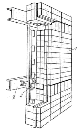 1 – блоктық шегендеу элементі (блоктық кірпіш); 2 – көтергіш көлденең шнеллерлер; 3 – блоктарға арналған кронштейндер