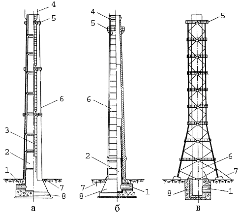 Химия өнеркәсібінде қолданылатын түтін құбырлары газдардың агрессивтілігіне, олардың температурасына және биіктігіне байланысты әртүрлі (2.31-сурет).