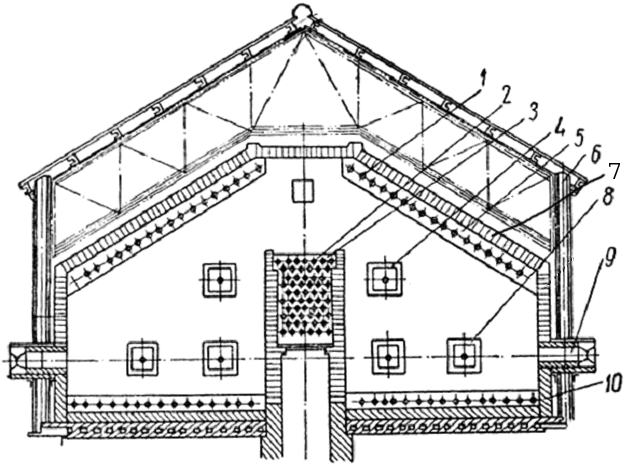 1 – төбелік экран; 2 – конвективті камераның құбырлары; 3 – конвективті катушканың құбырлы торы; 4 – жарылғыш терезе; 5 – суспензия; 6 – жақтау; 7 – Арка; 8 – қарау терезесі; 9 – саптама;10 – астыңғы экран