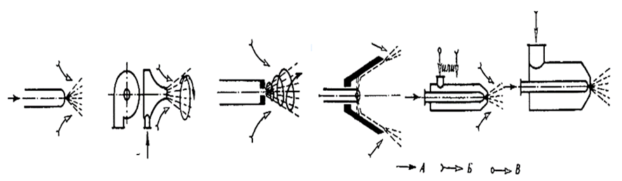 2.9-сурет – Отынды мазутты форсункалармен бүрку схемасы: а-отын; Б – ауа; В – бу.