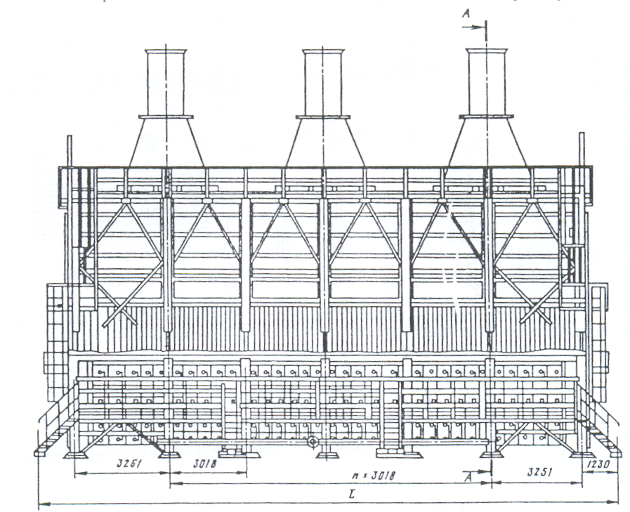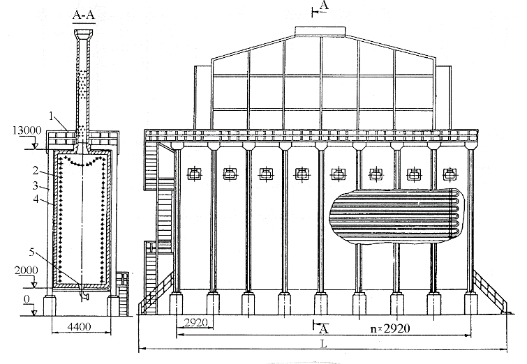 2.48-сурет – Тік бұрышты және көлденең бұралған катушкасы бар секциялы пеш, жеке конвективті камера және кіріктірілген ауа жылытқышы, отынды тігінен жағу