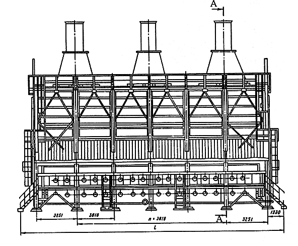 2.51-сурет – Оттықта орталық призмасы бар құбырлы төрт камералы пеш, алаудың биіктігі бойынша төсеніш алауы және дифференциалды ауа беру, бір қатарлы қабырға және екі қатарлы камерааралық экрандар