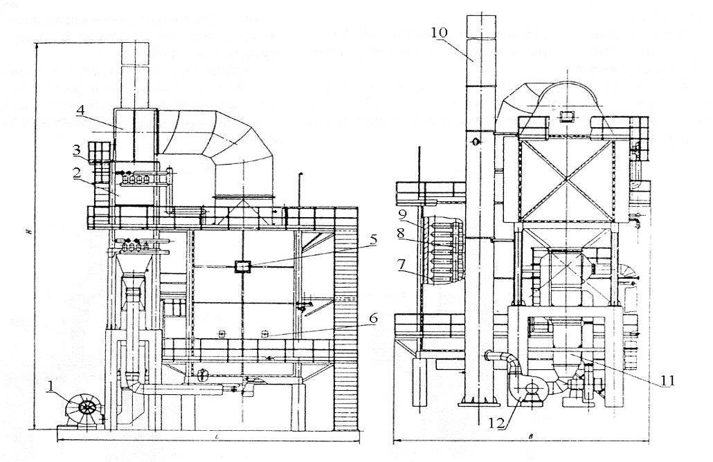 1 – желдеткіш; 2 – конвекция камерасы; 3 – баспалдақ; 4 – газ жолы; 5 және 6 ¬ – шығатын және қарайтын терезелер; 7 – радиантты катушка; 8 – құбыр торы; 9 – жақтау; 10 – түтін құбыры; 11 – ауа жылытқышы; 12 – түтін сорғысы