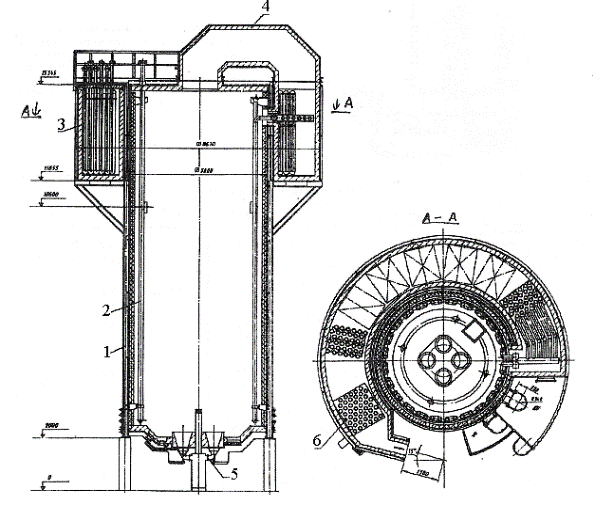 1 – футеровка; 2 – каркас; 3 – ирек; 4 – сору және қарау терезелері; 5 – жалынсыз газ жанарғысы; 6-баспалдақ алаңы