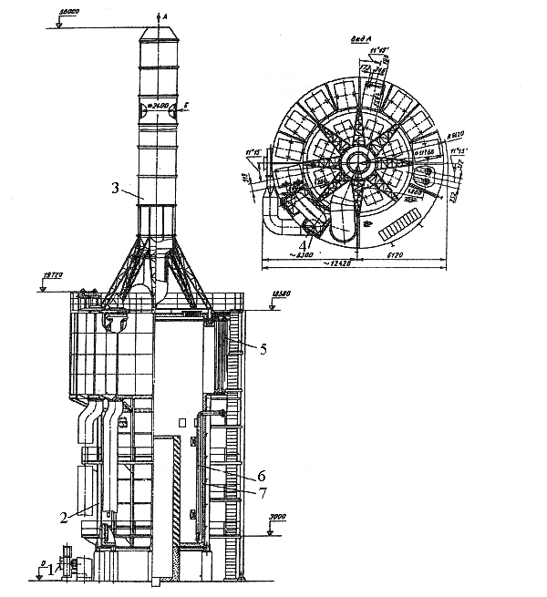 1 – желдеткіш; 2 – жақтау; 3 – түтін құбыры; 4 – ауа жылытқышы; 5 – конвективті катушка; 6 – радиантты катушка; 7 – төсеу