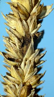 Symptoms of disease and morphology of pathogen. The disease symptoms become more noticeable as the wheat reaches the stage of waxy maturity. In infected plants, the glumes tend to slightly separate, exposing the smut bag (Figure 60). When the ear is crushed, it releases a greyish fluid or a dark, powdery substance. The affected ears are lighter in weight, do not bend downwards, and display a greyish-purple colour. Additionally, they emit a fishy odor, which is attributed to trimethylamine present in the teliospores. During harvest, the smut bags rupture, dispersing teliospores that settle on the grains, stubble, and surrounding soil. The species T. caries and T. levis can be differentiated by their teliospore structure (Figure 61).
