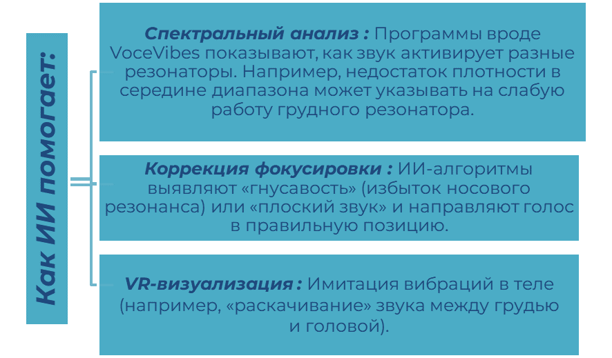 Искусственный интеллект (ИИ) меняет подход к работе с голосом. С помощью современных технологий ИИ-системы могут анализировать звуковой поток в реальном времени, выделять вклад каждого резонатора в общий звук и представлять его в графическом виде. ИИ превращает внутренние, абстрактные ощущения в наглядный и понятный процесс.