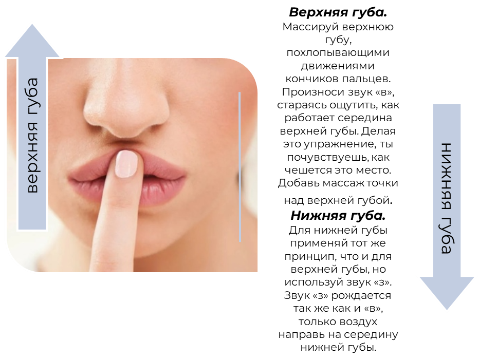 Одно из ключевых требований к выполнению данных упражнений заключается в достижении ощущения легкой вибрации в области верхней губы и гортани. Основная цель этих упражнений состоит в коррекции глухого звучания голоса, способствуя улучшению его резонансных характеристик.