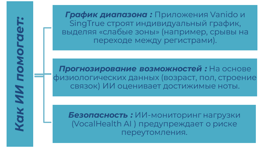 2 Использование ИИ-приложений: программы с анализом голоса (Vanido, Voice Analyst, VoCo) автоматически определяют диапазон, выделяют наиболее стабильные регистры и указывают «слабые места» - звуки, на которых голос теряет силу или чистоту.