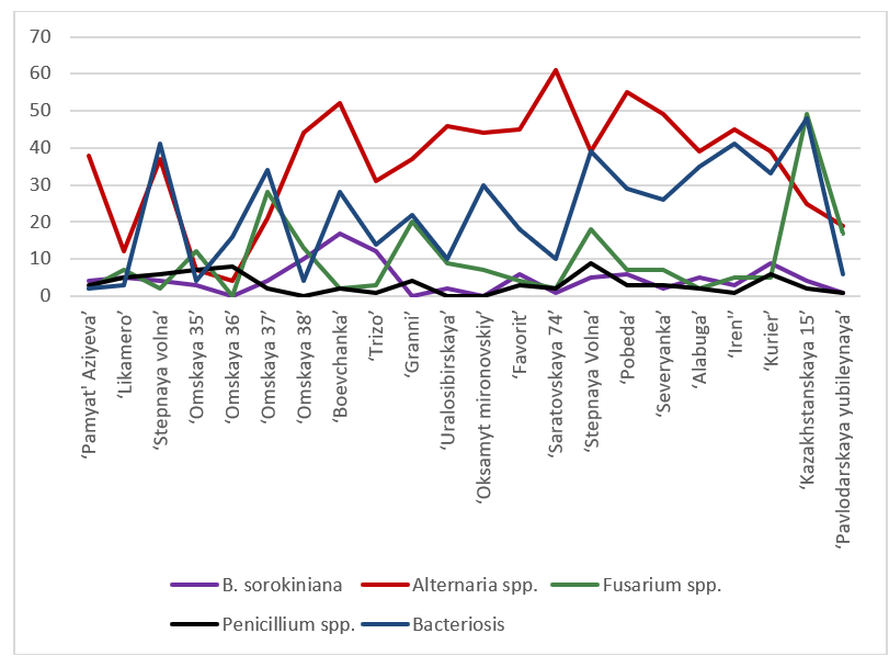 Table 3 presents data on the ratio of healthy and infected seeds and the prevalence of phytopathogens in the tested spring wheat varieties.