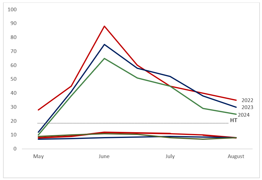 Analysis of soil samples taken from different regions of the Pavlodar district, depending on the previous crop, showed that the frequency of occurrence of the fungi named Bipolaris sorokiniana reached the economic threshold in each year of the study, dominating in the months of July to August (Figure 26). Field and laboratory experiments showed that crop rotation played an important role in the development and spread of root rot. The rotation of susceptible crops in sowing helps to suppress the accumulation of infection in the soil.