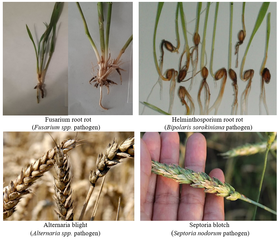 The dominant pathogen identified in the study was Bipolaris sorokiniana, causing helminthosporium root rot. The disease manifested as browning of the coleoptile, yellowing, and deformation of leaves, and overall plant stunting in seedlings and emergence stages of wheat. In later stages of vegetation, infected plants showed rotting, browning, and blackening of primary and secondary roots, as well as the tillering node and the lower part of the stem. helminthosporium root rot was observed in every stage of wheat vegetation, ranging from 5% to 40%. In later stages, Bipolaris sorokiniana contributed to the development of spot blotch, characterised by light brown spots surrounded by chlorosis on leaf blades. Among the plants affected by this disease, 12% showed browning and shrivelling, 8% exhibited white heads, and 8% had black spots caused by Bipolaris sorokiniana. The development and spread of this pathogen in the North-East of Kazakhstan were influenced by prolonged drought and optimal air temperatures (22-26 °C). The pathogen showed a tendency to increase in dense plantings, agroecosystems with deep seed burial, and contaminated plantings, which served as reservoirs for pathogenic infection.