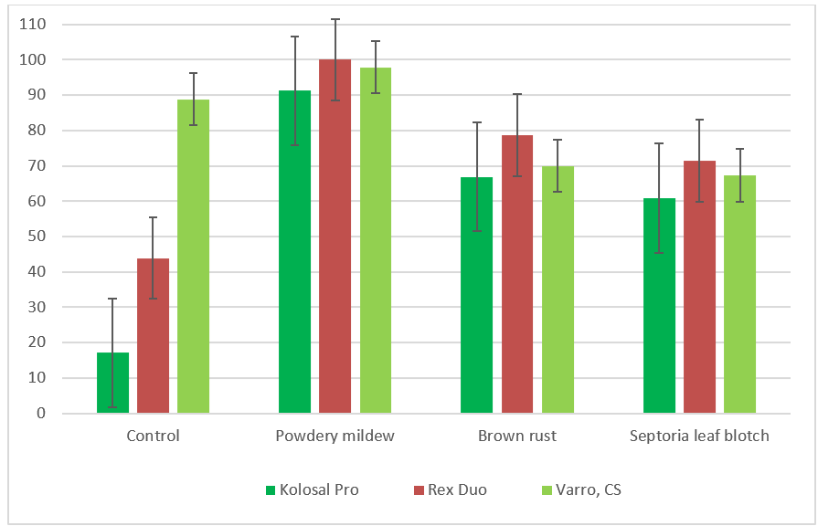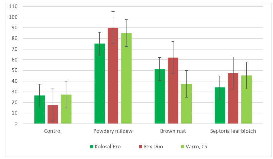 After 22 days of treatment, the prevalence of brown rust increased to 70% in the control plot, while it was significantly reduced to 12-13% in the treated plots. The degree of disease development reached 45% in the control plot, but only 8% in the treated variants. The biological effectiveness of Rex Duo against brown rust in spring wheat was 80-84% after 22 days.