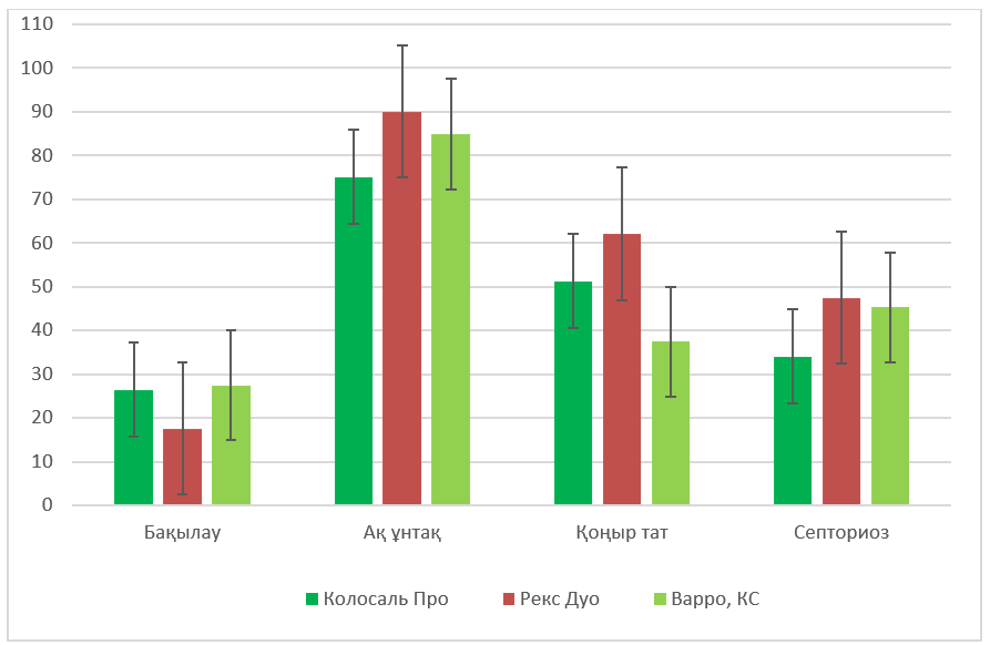 Жаздық бидайда ақ ұнтақ Erysiphe graminis, қоңыр жапырақ таты Puccinia triticina және септориоз Septoria sp. аурулары дамыды. Фунгицидтерді қолданар алдында (флаг жапырағының шығу фазасында) ақ ұнтақтың таралуы агроценоздарда 30 %-ға дейін, қоңыр тат – 15 %-ға дейін, ал септориоз – 25 %-ға дейін жетті. Фунгицидтерді қолданғаннан кейін 10 күн өткен соң бұл аурулардың таралуы айтарлықтай төмендеді: ақ ұнтақ – 75,1–90,1%, қоңыр тат – 51,3–62,1 %, септориоз – 34,1–47,5 %. Осылайша, зерттелген аурулар кешеніне қарсы ең жоғары тиімділік Рекс Дуо препаратына тән болды. Осы фунгицидті қолданғаннан кейін 20 күн өткен соң ақ ұнтақ толығымен басылды, қоңыр жапырақ таты 78,6 %-ға, ал септориоз 71,5 %-ға төмендеді. Бақылау учаскесінде осы мерзімде ақ ұнтақты зеңнің таралуы 17,1%-ға дейін төмендеді, бұл төмендеу абиотикалық факторлардың әсерімен байланысты, алайда қоңыр жапырақ таты мен септориоздың таралуы өңделмеген учаскеде тиісінше 43,9 % және 88,8 %-ға жетті (5-кесте, 31, 32-сурет).