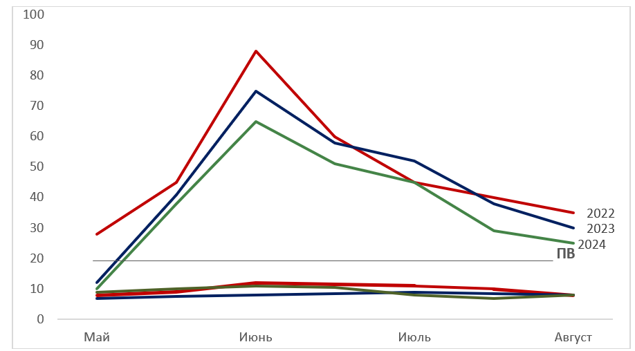 Анализ почвы на наличие конидий возбудителя корневой гнили определяли методом соответствующих флотации. Анализ образцов почв, взятых с различных районов Павлодарской области в зависимости от предыдущей культуры, показал, что частота встречаемости гриба Bipolaris sorokiniana достигала экономического порога в каждый год исследования, доминируя в период с июля по август месяцы (рисунок 26). Полевые и лабораторные опыты показали, что соблюдение севооборота имеют важную роль при развитии и распространении корневой гнили. Соблюдение ротации восприимчивых к корневой гнили культур в посевах сдерживает накоплению инфекции в почве.