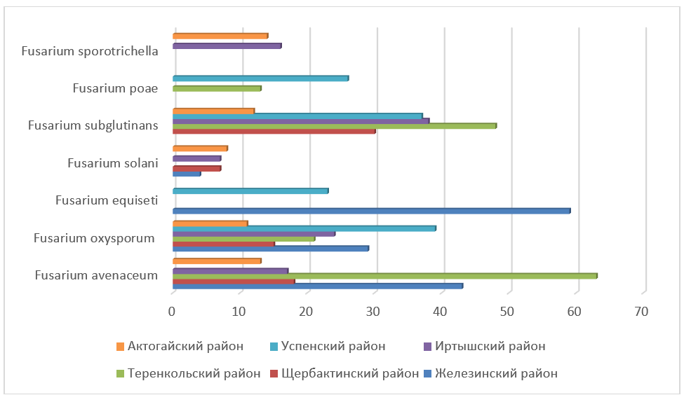 В ходе проведенного исследования в изученных образцах почвы преобладали такие виды фузариума как Fusarium oxysporum, Fusarium avenaceum, Fusarium solani, Fusarium subglutinans. Менее распространенными были Fusarium equiseti и Fusarium sporotrichella. Полученные результаты показывают, что в целом порог вредоносности по плотности популяции грибов рода фузариум не превышается за исключением отдельных случаев. Количество пропагул видов рода Fusarium имеет значительные показатели в агроценозах Железинского и Щербактинского районов. Для данных районов рекомендуется создание фонда здорового посадочного материала, введение фитосанитарных севообротов, использование при производстве пшеницы выносливых и устойчивых сортов к фитопатогенам, проведение мероприятий, стимулирующих влагонакопление в почвенном субстрате, внесение в агроценозы сбалансированных по NPK минеральных удобрений, протравливание семян системными, контактными и биологическими препаратами.