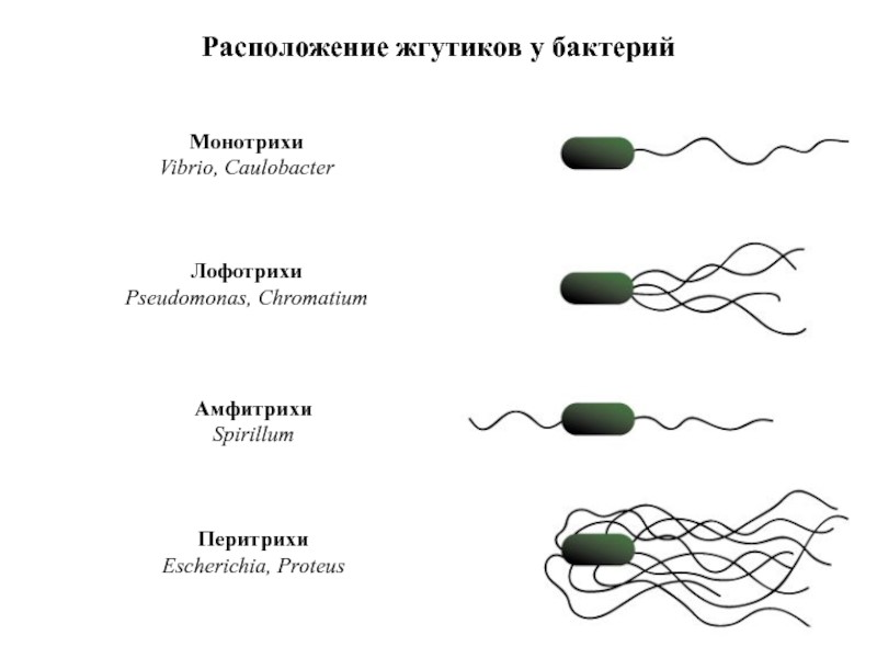 Флагеллалардың орналасуы бойынша қозғалмалы бактериялар төрт топқа бөлінеді: монотрихтер ұшында бір флагелла орналасқан бактериялар; лофотрихтер бір ұшында флагелла шоғыры бар бактериялық жасушалар; амфитрихтерде екі полюсте бір немесе бірнеше флагелла болады; перитрихтерде жасушаның бүкіл бетінде көптеген флагелла болады (сурет. 5).