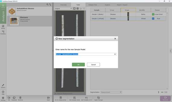 Эталондық модельді құру үдерісі гиперспектралды кескіндердің фондық пикселдерін жоюға негізделеді. Бұл әдіс өсімдік үлгілеріндегі ауыл шаруашылығы дақылдарының ауру қоздырғыштарымен зақымданған аймақтарды автоматты түрде сегменттеуге мүмкіндік береді.