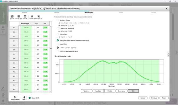 - 3-кезең: зақымданған аймақтардың бастапқы спектрінен толқын ұзындығының диапазонын (әдетте барлық диапазон әдепкі түрде таңдалады) (58-сурет), негізгі компоненттер бойынша модельдік жүктемелерді (59-сурет) таңдау, салмақ коэффициенттерін бағалау (60-сурет); маңыздылық көрсеткіштерін талдау (61-сурет), таңдалған толқын диапазонында сигнал мен шудың қатынасын бағалау (62-сурет). Алдын ала өңдеу кезеңінде SNV (Standard Normal Variate correction) әдісі қолданылады. Бұл әдіс спектроскопиялық деректерде үлгілердің тығыздығы мен қалыңдығындағы айырмашылықтарды, сондай-ақ жарықтың шашырауынан туындайтын мультипликативтік әсерлерді азайту үшін қажет;