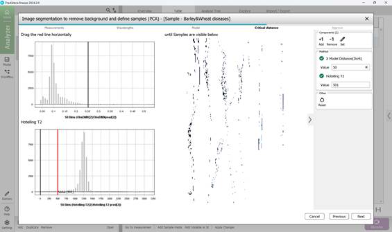 4) определение показателей критического расстояния необходимое для идентификации отношения пикселей к образцовой модели. Гистограмма, отражающая критическое расстояние, содержит информацию по всем пикселям изображений. Фиксирование красной линии позволяет перемещать порог включения определенных пикселей, целью чего является включение пикселей только тех участков, которые соответствуют пикселям поражения болезнями и исключение пикселей фона (рисунок 49, 50);