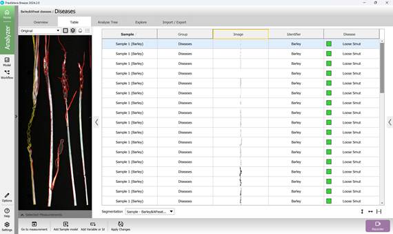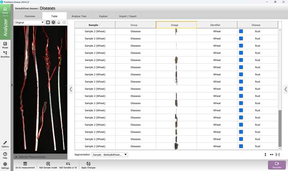 Процесс создания эталонной модели основывается на удалении фоновых пикселей гиперспектральных изображений, что позволяет обеспечить автоматическую сегментацию пораженных возбудителями болезней сельскохозяйственных культур участков на растительных образцах.