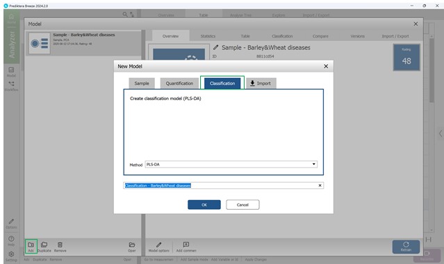 Затем в левой части нижней панели осуществляется выбор кнопки «Add», в результате чего открывается мастер создания «Новой модели», где выбирается третья кнопка «Classification» и метод классификации «PLS-DA», основанный на частичных наименьших квадратах с категориальными переменными (классами) (рисунок 55).