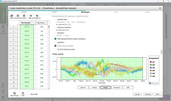 - этап 3: выбор: диапазонов длин волн в пределах необработанного спектра отдельных пораженных участков образцов (по умолчанию обычно включаются все диапазоны длин волн) (рисунок 58), модельных нагрузок (рисунок 59), весовых коэффициентов в рамках выбранного волнового диапазона по основным компонентам (рисунок 60); просмотр: показателей значимости (рисунок 61), показателей отношения сигнал-шума в рамках выбранного волнового диапазона (рисунок 62). На этапе предварительной обработки применяется метод SNV, который расшифровывается как Standard Normal Variate correction. Использование данного метода в обработке спектроскопических данных позволяет минимизировать различия в плотности и толщине образцов, а также влияние мультипликативных эффектов рассеяния света;