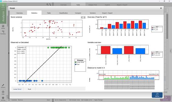 - этап 5: оценка созданной модели PLS-DA осуществляется по трем основным графикам – «Observed vs. Calculated», «Overview» и «Variable overview». На графике «Observed vs. Calculated», представляющем диаграмму разделения классов по одной оси, указываются истинные значения классификации определенных образцов к конкретных классам, по другой оси предсказанные моделью значения в отношении каждого образца. График «Variable overview» демонстрирует дисперсию «R2» (насколько хорошо модель может описывать различия между классами данных, использованных для обучения) и предсказательную способность «Q2» для каждого класса (насколько хорошо модель может предсказывать определенные участки культур, пораженные заболеваниями, в процессе кросс-валидации). Далее осуществляется переход к кнопке «Finish», на чем завершается создание классификационной модели (рисунок 65).